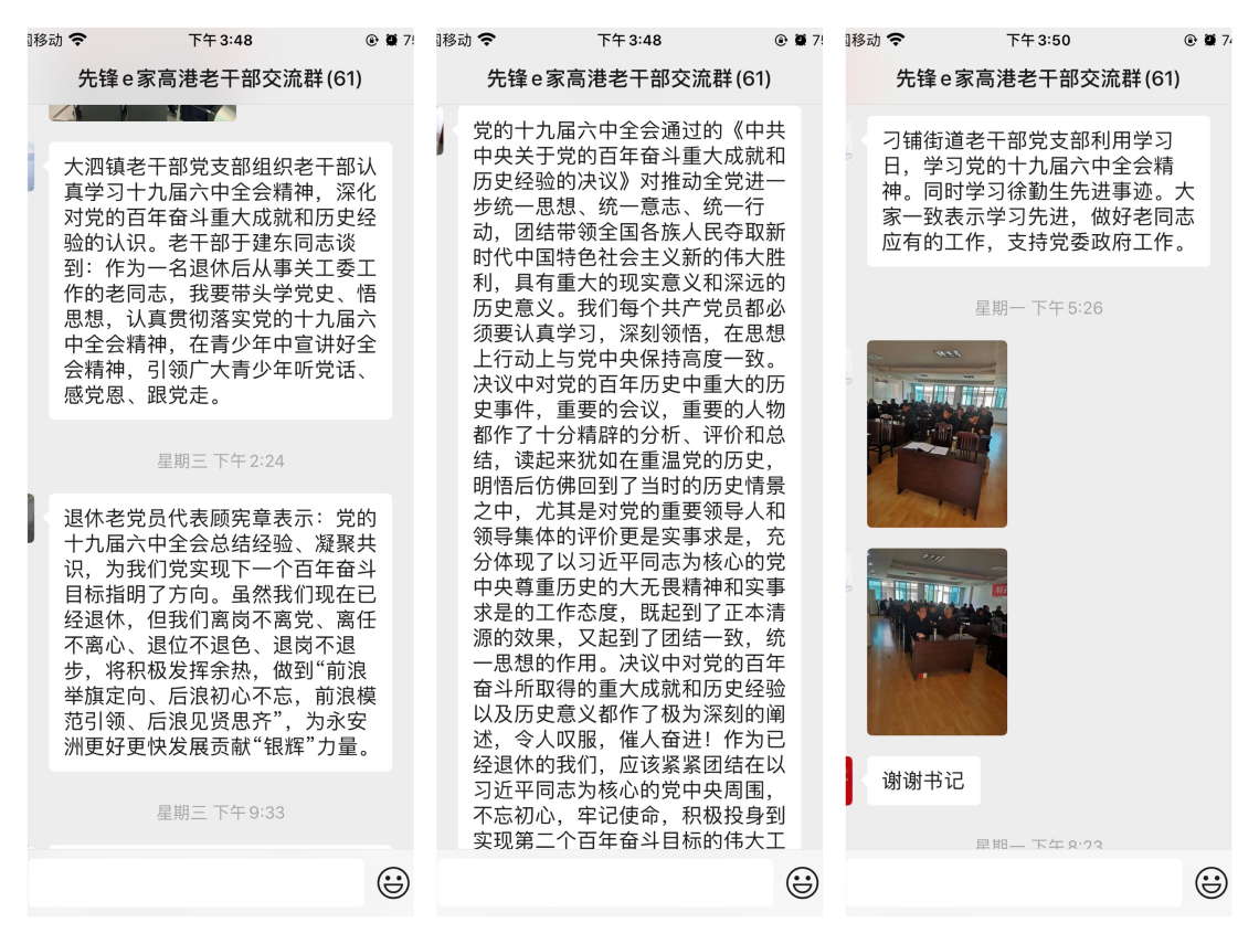 “联动式”深学。口岸街道、许庄街道、胡庄镇等地的机关、社区老干部支部进行支委联动交流。一方面,总结、分享自身支部学习全会的做法,对标找差、学习经验;另一方面,共同探讨支部在“党建联盟”“党史宣讲”方面的计划,提出要转化全会精神,借助党史学习教育契机,和更多老党员联动起来,成立“银发”党史宣讲新品牌,让全会精神走进群众生活。