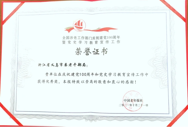日前,中国老年报社公布全国涉老工作部门庆祝建党100周年和党史学习教育宣传工作优秀单位,浙江义乌市委老干部局上榜。