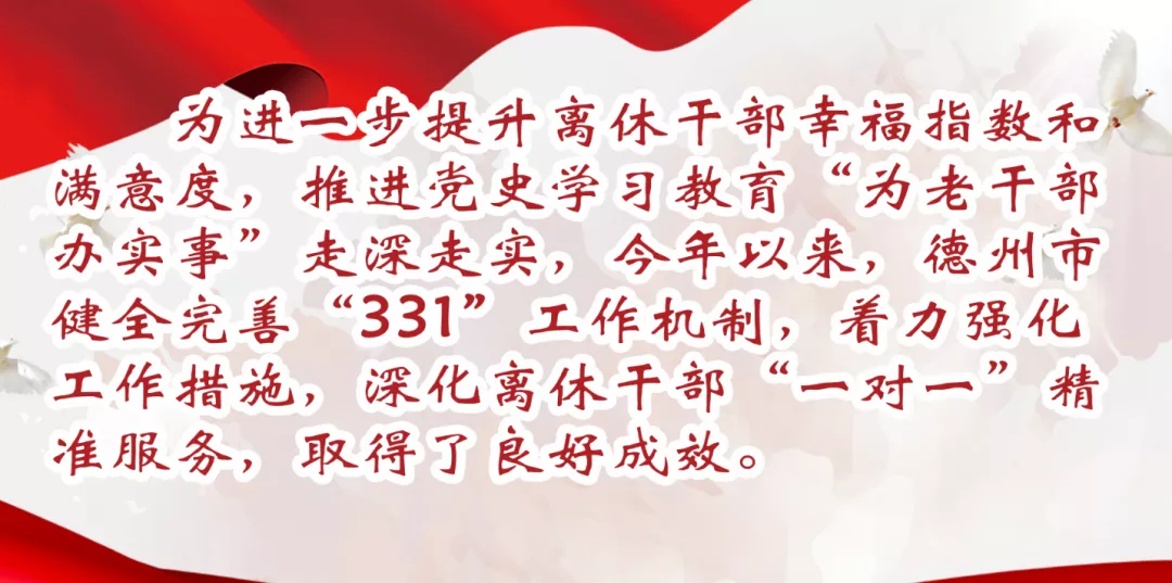 三是深入开展“为离休干部办实事”活动。按照党史学习教育“我为群众办实事”实践活动要求,将离休干部个人情况分门别类,建档立卷,做到离休干部一人一档。今年以来,组织全市离休干部进行了健康体检,组织部分身体条件允许的离休干部开展了健康疗养。充分发挥离休退休干部工作领导小组成员单位职能,聚焦离休干部反映集中的共性需求和存在的普遍性问题,通过联系公益性服务机构、开展志愿服务等多种方式,协调推进问题解决,为离休干部提供精准化个性化服务。乐陵市还通过购买社会服务的方式,每月为离休干部提供医疗保健、精神慰藉、生活照料、居家服务等4大类12项服务,建立完善了离休干部居家智慧养老新模式,赢得了老同志高度评价和充分认可。