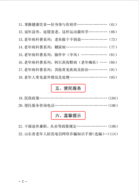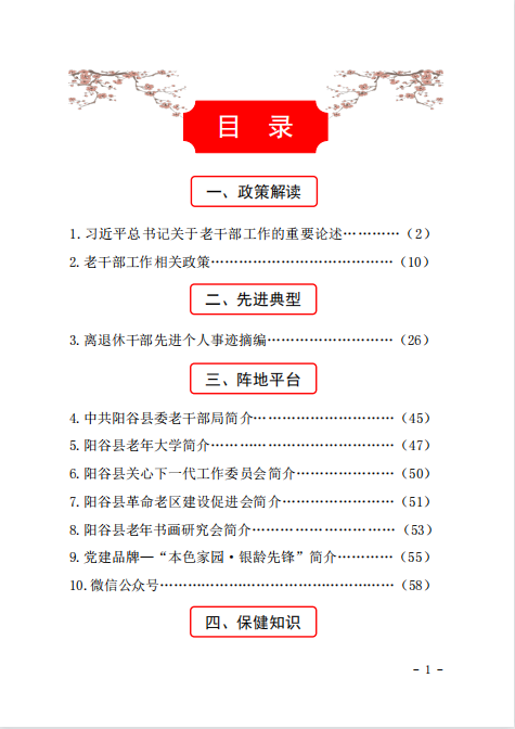 服务手册共分为政策解读、先进典型、阵地平台、保健知识、便民服务、温馨提示等六个部分,包括了全县老干部工作相关政策、老干部服务平台介绍、老干部活动资源整合等内容,以便于为全县广大离退休干部学习、活动、就医、服务等提供全面的服务指引。