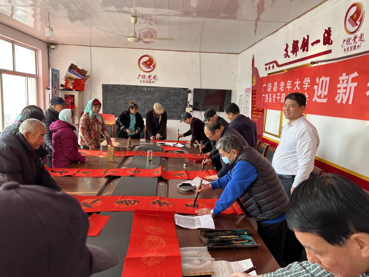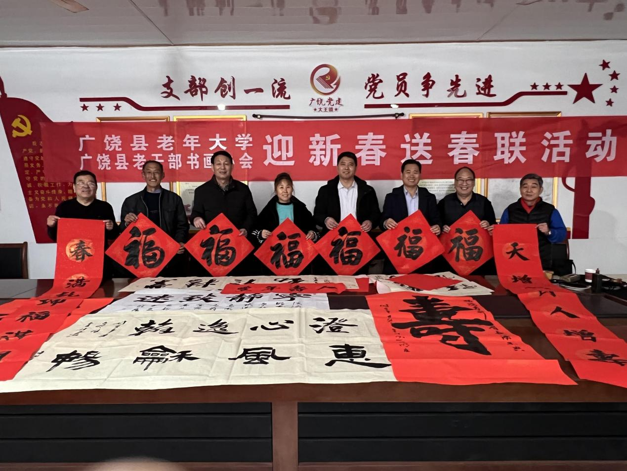 1月6日,东营广饶县老年大学、县老干部书法协会组织书法爱好者走进大王镇明庄村为村民现场书写春联、送福字,提前送去浓浓的新春祝福。