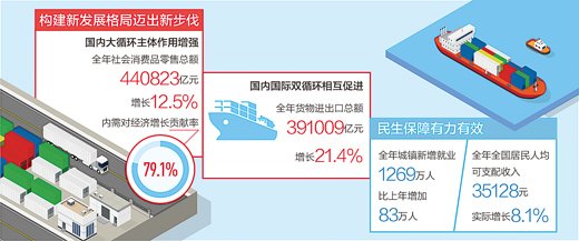 “过去一年,经过全国上下共同努力,我国经济发展和疫情防控双双保持全球领先地位,国民经济总体运行在合理区间,全年发展的主要目标任务已经完成,构建新发展格局迈出新步伐,高质量发展取得新成效,‘十四五’实现了良好开局。”1月17日,在国新办新闻发布会上,国家统计局局长宁吉喆说。