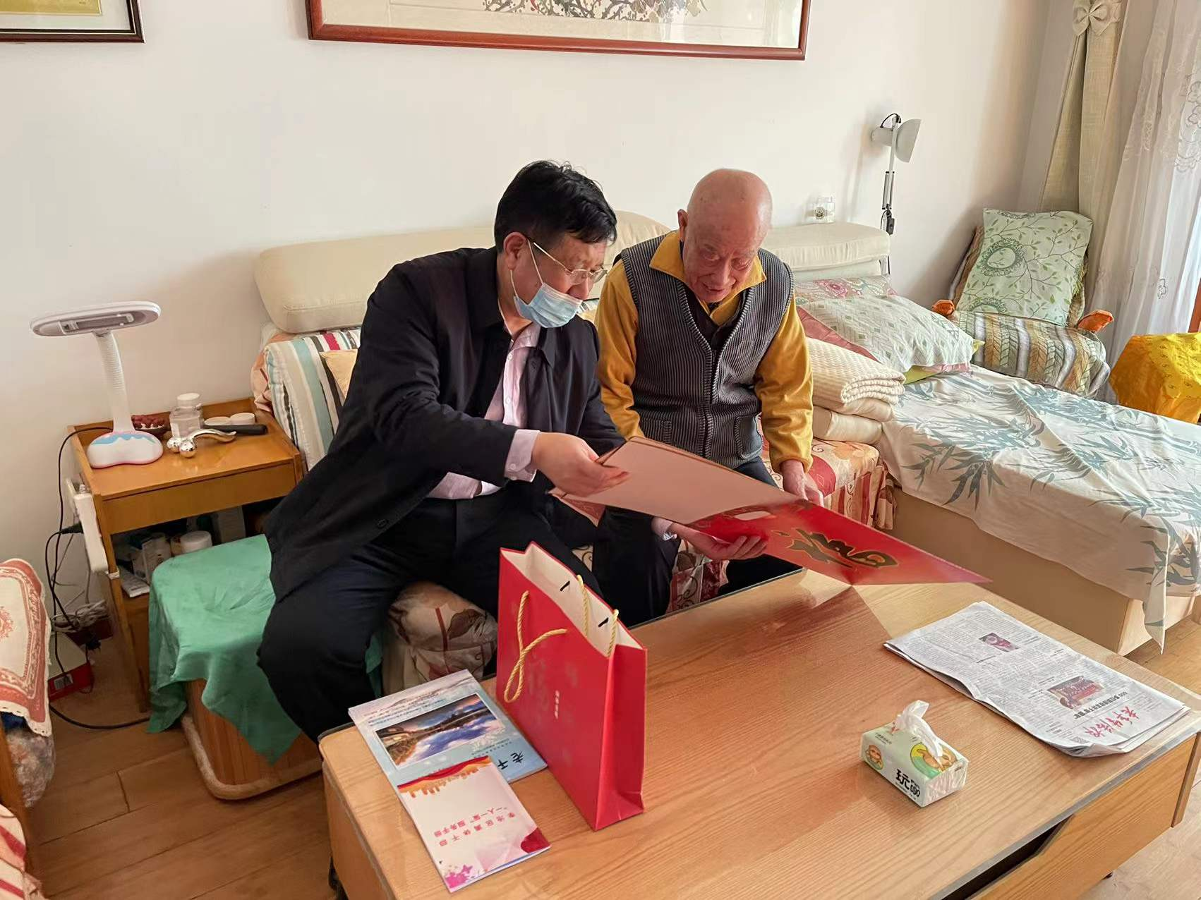 每到一户,工作人员将李沧区委老干部局自办杂志《老干部之窗》和春节福字送到老干部手中,并送去大米、花生油、压力锅、杂粮等慰问品,真正把组织的关怀和新春祝福及时送到老干部的心坎上。