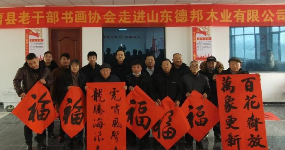 1月17日,菏泽曹县老干部书画协会主席高福来率领书画家王宝贵、王鸿昌、王耀真等一行12人,赴韩集镇山东德邦木业有限公司举行书画笔会活动,为公司员工和周边群众写春联,送温暖,喜迎春节。