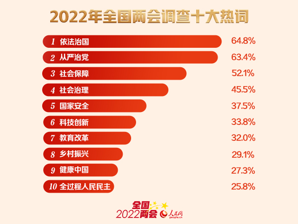 民之所盼,政之所向。2022年1月30日至2月25日,人民网开展第21次全国两会调查,超过562万人次参与。网友投票结果显示,“依法治国”“从严治党”“社会保障”三大热词关注度位居前三位,位列热度第四位至第十位的热词分别是“社会治理”“国家安全”“科技创新”“教育改革”“乡村振兴”“健康中国”“全过程人民民主”。