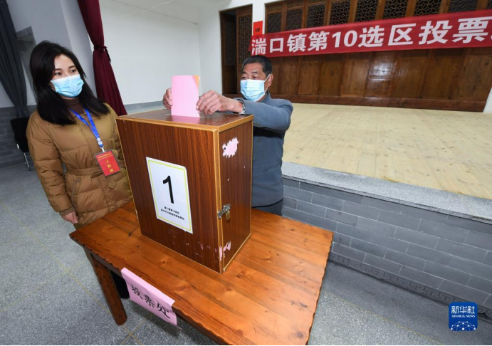 在设在浙江省杭州市临安区湍口镇迎丰村的一个基层人大换届选举投票站,村民在参加投票,村级监察联络员监票(2021年12月14日摄)。新华社记者 徐昱 摄
