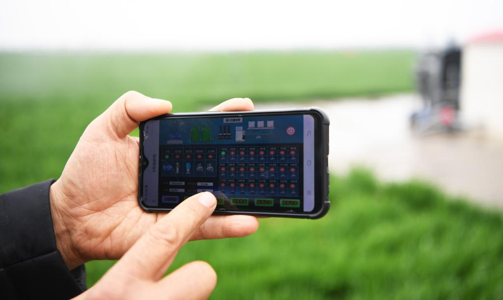 3月22日,种粮大户邱守先正在使用手机操控设备对麦田进行灌溉。新华社记者 张浩然 摄