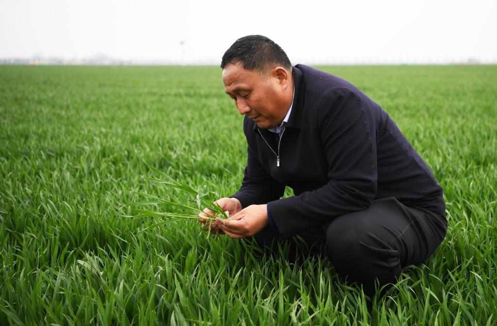 3月22日,种粮大户刘天华在商水县高标准农田示范区查看自家小麦长势。新华社记者 张浩然 摄