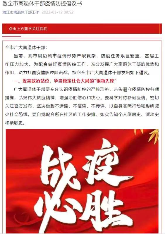 面对严峻复杂的疫情防控形势,江苏泰州靖江市委老干部局坚决贯彻落实党中央决策部署和省委、市委有关要求,高度重视离退休干部防护和健康工作,多措并举做好疫情期间老干部服务保障工作,积极引导老干部携手战“疫”,确保“保障不缺席、服务不打烊”。