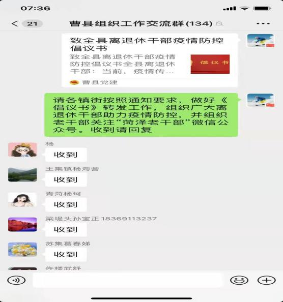 当前,疫情传播风险和防控形势严峻复杂,为贯彻落实菏泽市委、市政府和曹县县委、县政府关于疫情防控的工作部署,充分发挥全县离退休干部的优势和作用,菏泽曹县县委组织部在“曹县党建”微信公众号上发布《致全县离退休干部疫情防控倡议书》,在“曹县老年大学”微信公众号转发《致全市离退休干部疫情防控倡议书》,同时转发至“曹县组织工作交流群”“曹县老年大学各班级群”,倡导广大离退休干部在做好自身防护的同时,助理疫情防控。