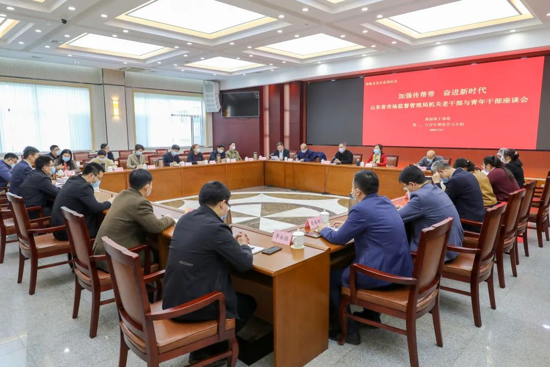 为喜迎党的二十大胜利召开,深化党史学习教育,传承光荣传统,讲好红色故事,3月22日,山东省市场监管局以“加强传帮带,奋进新时代”为主题,召开老干部与青年干部座谈会。局机关离退休干部党委书记王殿华等老干部代表,省局第二、第六青年理论学习小组青年干部参加座谈。