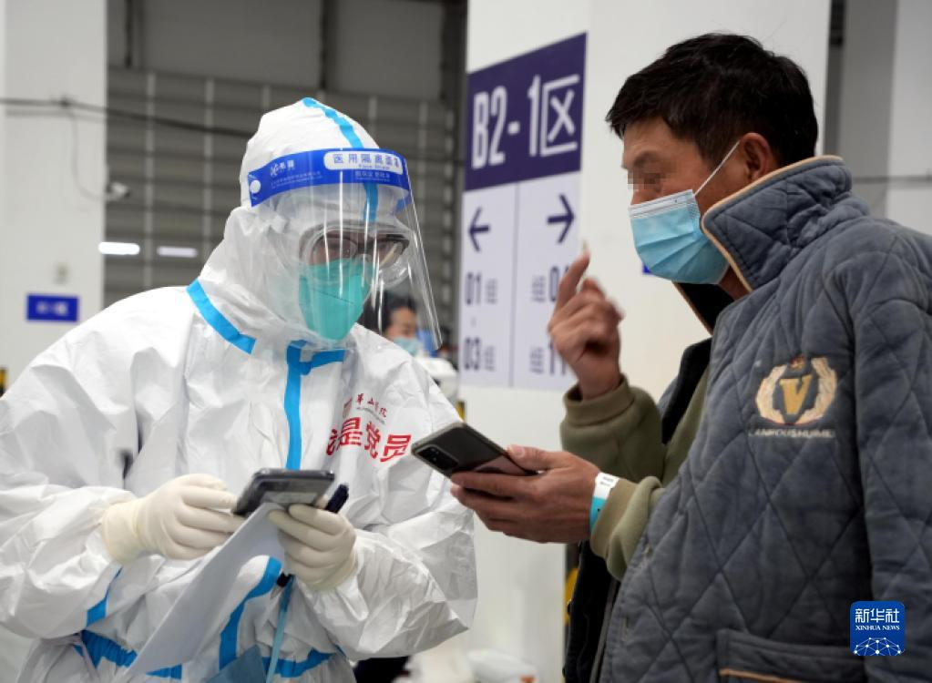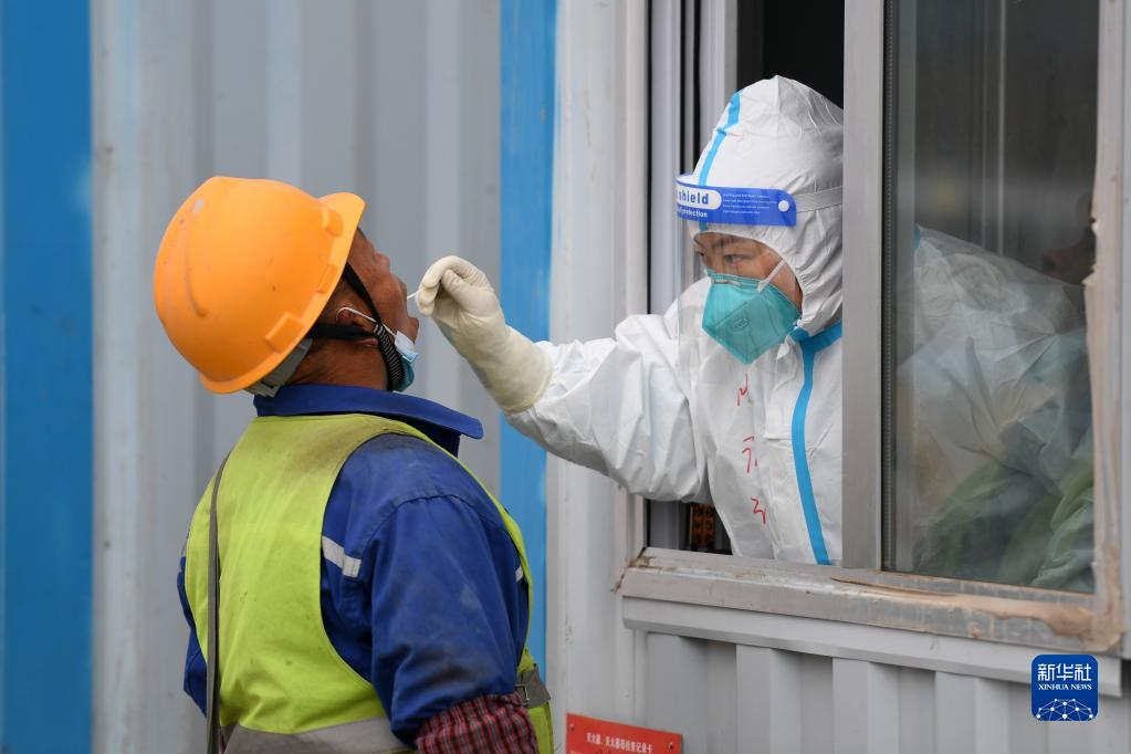4月16日,在西宁经济技术开发区南川工业园区一企业建设工地,医务人员进行核酸采样。近日,根据青海省西宁市疫情防控政策要求,西宁经济技术开发区南川工业园区管理委员会针对园区企业集中、建设项目繁多、施工人员密集等特点,在企业建设工地设置核酸采样点,引导工人们有序开展全员核酸检测,助力企业做好疫情防控,保障项目建设。新华社记者 范培珅 摄