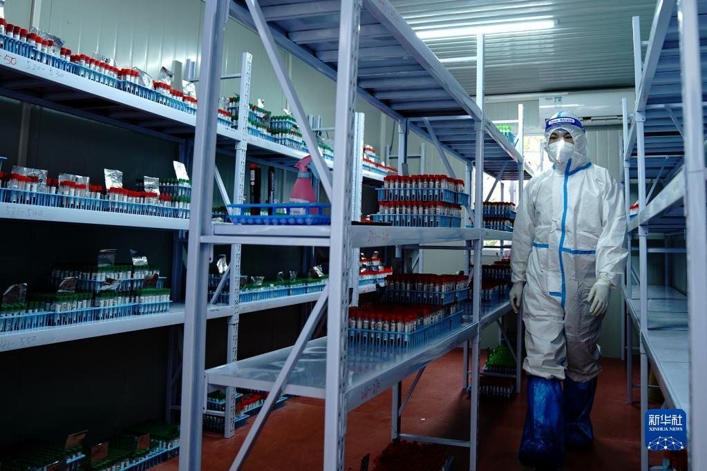 4月15日,工作人员在核子华曦核酸检测方舱实验室的样本暂存间忙碌。为提高核酸检测能力,上海增设了很多移动的核酸检测实验室。从集中搭建的方舱式实验室,到像“温室大棚”一样的气膜实验室,在先进技术和援沪检测人员的共同加持下,移动的核酸检测实验室让核酸检测更加高效、灵活。新华社记者 张建松 摄