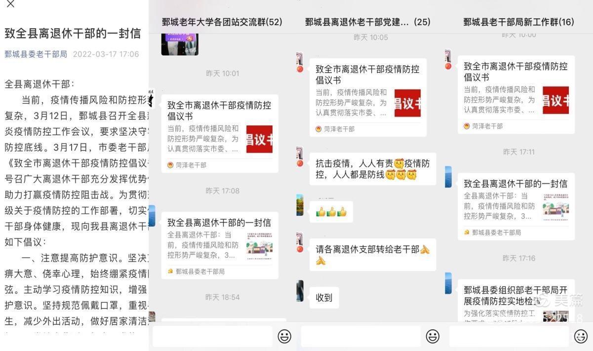 本轮疫情发生后,鄄城县委老干部局第一时间向全县离退休干部发出《疫情防控倡议书》,并通报最新疫情形势。同时通过微信公众号、工作群等平台,以图文并茂、通俗易懂的形式,广泛宣传疫情防控政策、防疫健康知识等。全县广大离退休干部党组织迅速响应号召,发挥战斗堡垒作用,引导老同志坚定信心,加强个人防护,自觉配合疫情防控工作,发挥模范表率作用,为夺取疫情防控阻击战全面胜利贡献智慧和力量。