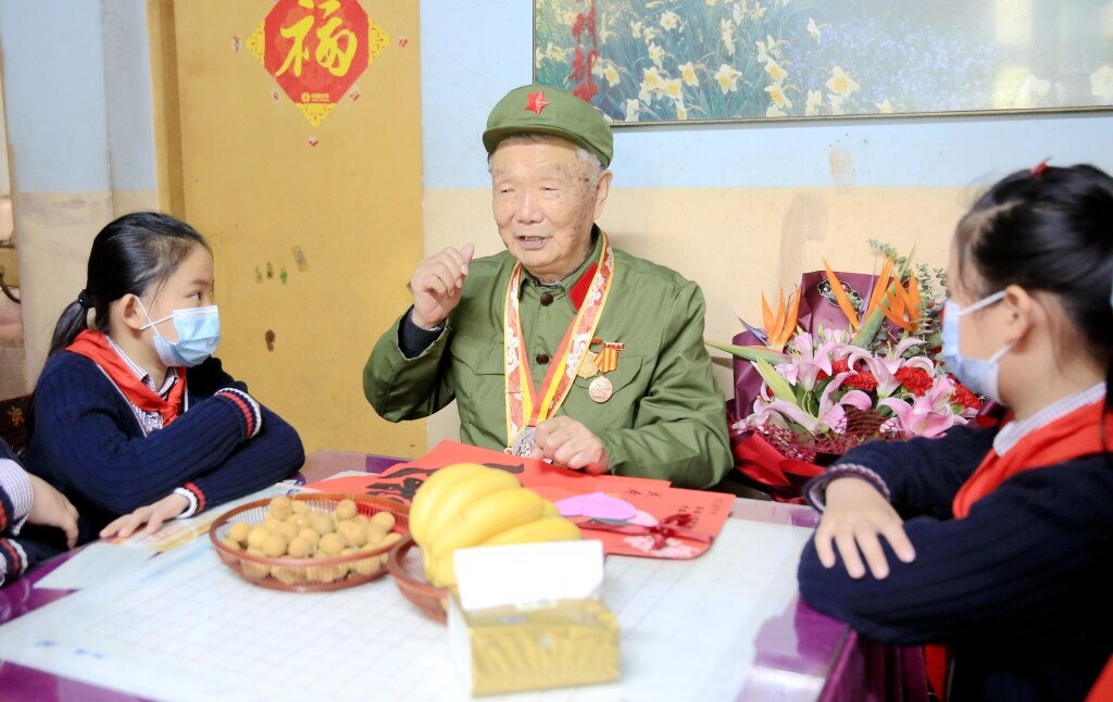 “这是继2021年4月20日后的第二次寻访,同一时日,不同风景。这回,我们寻访的脚步,移转到张老家中。”靖江外国语学校中队辅导员韩姗殷老师说,屋里的老方桌、老照片,还有身着军装的老战士张一飞,让孩子们的爱国情怀得到再一次升华。
