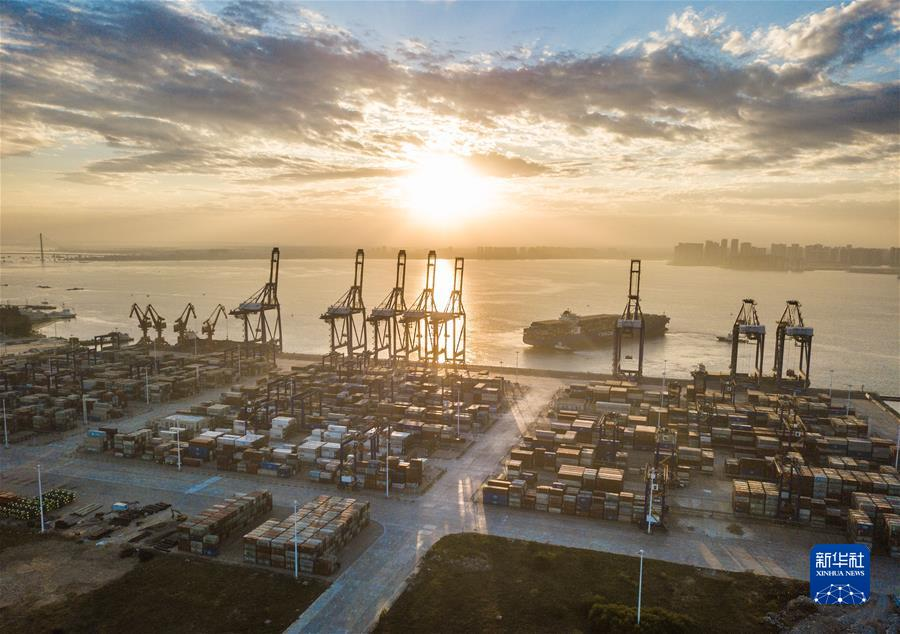这是2021年12月5日清晨在海南洋浦经济开发区拍摄的海南自贸港建设重要的集装箱航运枢纽——洋浦国际集装箱码头(无人机照片)。新华社记者 蒲晓旭 摄