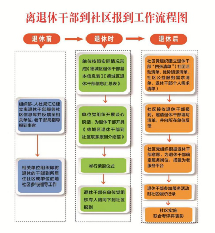 老干部退休前,由区委组织部、区人社局于每年年初汇总当年退休干部人员名单并反馈至相关单位,区委老干部局负责指导报到事宜。相关单位接到通知后,组织即将退休的干部到居住地社区或单位驻地社区参与社区治理工作。