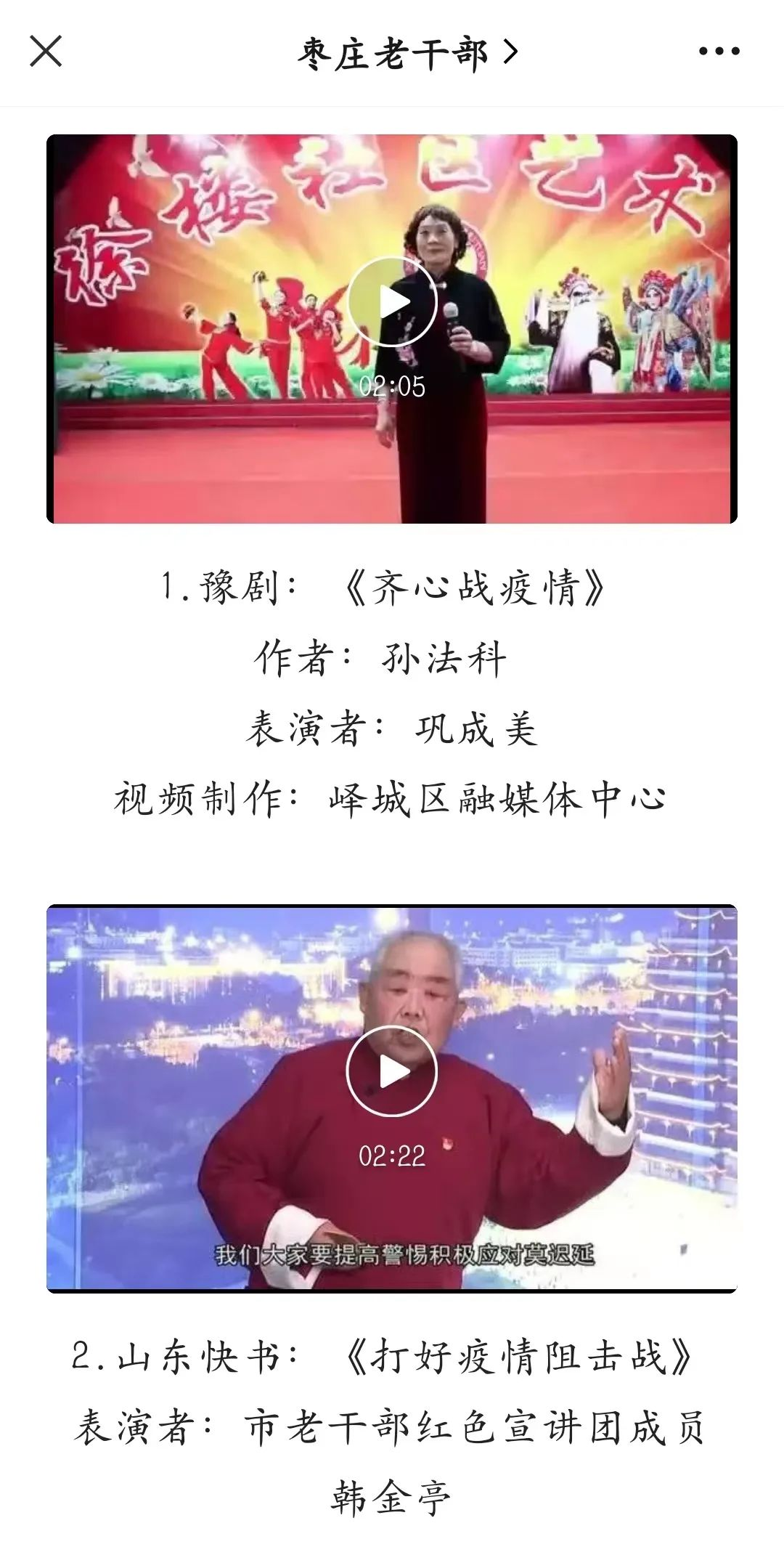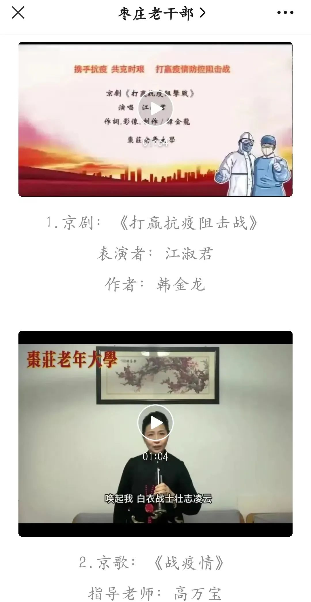 为打通文化养老“最后一公里”,不断扩大老年文体活动的有效供给,让更多老同志足不出户乐享文化生活,开设枣庄老干部颐心银辉云剧场,组织老同志开展线上文化艺术优秀作品展示。现已成功举办线上优秀作品展10期,展播作品50余部,点赞投票一万三千余次,播放量两万余次。特别是疫情期间,广大老干部带头在做好居家隔离的同时,以云剧场为依托,用诗歌、散文、曲艺、绘画等艺术形式,将科学防控精神融入到文艺创作中,实现了居家抗疫与线上文体活动的两不误、双促进,在全市广大老同志中引起强烈反响。