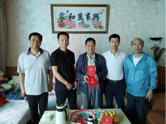县政协党组副书记、副主席胡其军带领机关党总支和老干部党支部的相关同志,为县政协老干部党支部的老党员李映声上门颁发“光荣在党50年”纪念章,并向他表示热烈的祝贺。