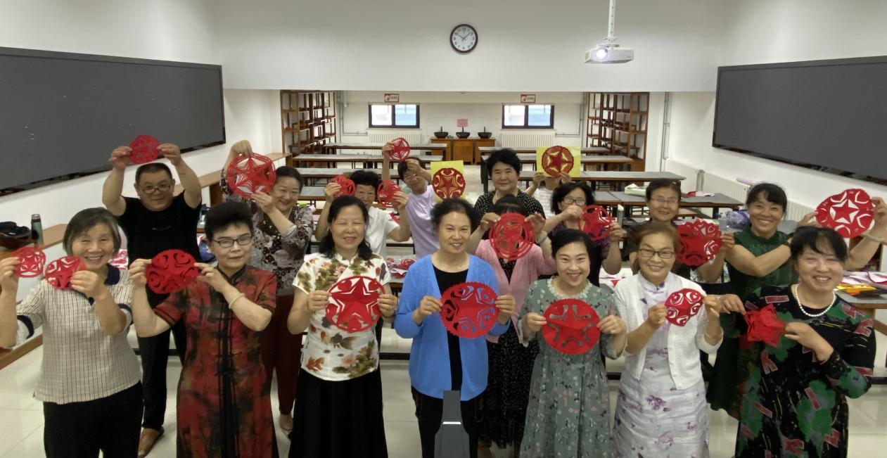剪纸班以“红心永向党”为创作核心进行大胆设计,折纸、勾画、裁剪……陈秀兰老师带领学员用灵巧的手指在纸上上演了一场绝美的“纸上舞蹈”,将对党和国家的祝福融入剪纸作品之中。