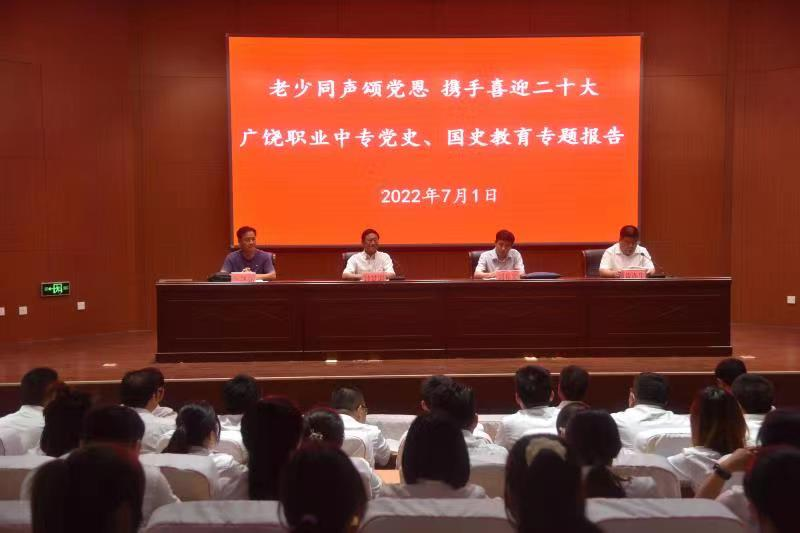 为庆祝中国共产党101岁华诞,迎接党的二十大顺利召开,深入贯彻落实中办、国办《关于加强新时代关心下一代工作委员会工作的意见》和省委、省政府《贯彻落实<关于加强新时代关心下一代工作委员会工作的意见>的若干措施》意见,7月1日,东营广饶县关工委主任钟景训,县“五老”志愿者协会副会长刘春光及“爱党爱国爱家乡”报告团成员李剑童来到县职业中专,为这里的青少年带来一场精彩的党史教育专场报告会。县职业中专校领导及师生380人参加会议。