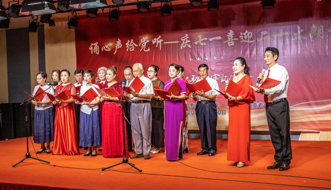 朗诵会在合诵《火红的七月》中结束,“把党徽别在胸前,把誓言刻在心头,老有所乐,老有所为,老也优秀!让党旗更红,使党旗更艳,坚定不移、矢志不渝跟党走!”铿锵有力、感人肺腑的誓言响彻会场。