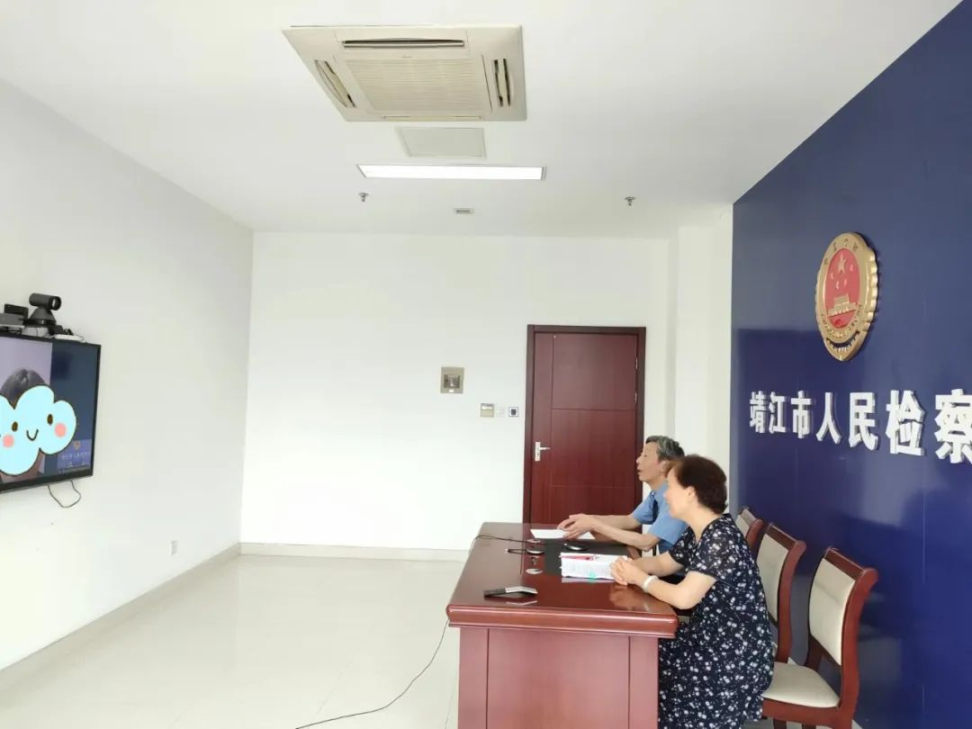 7月5日下午,在江苏靖江市人民检察院远程讯问室里,蔡金华、侯明霞两位退休检察官隔着屏幕对1名远在外地的被附条件不起诉人小吴进行考察帮教。