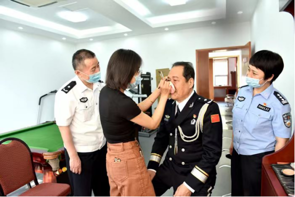 三是热心服务。摄影区、更衣区、化妆区和休息区均配备热水和防暑设备,并有工作人员和厅卫生所一名大夫全程服务。协助高龄体弱、行动不便的老同志换装、调整警衔、净面梳妆、整理服装,时刻提醒老同志注意安全。针对部分特体老同志,协调厅警务保障部追加制作3套特体警礼服。对济南以外的老同志,协调原所在单位安排车辆保障,划定拍摄时间,最大限度地满足广大老同志的心愿。