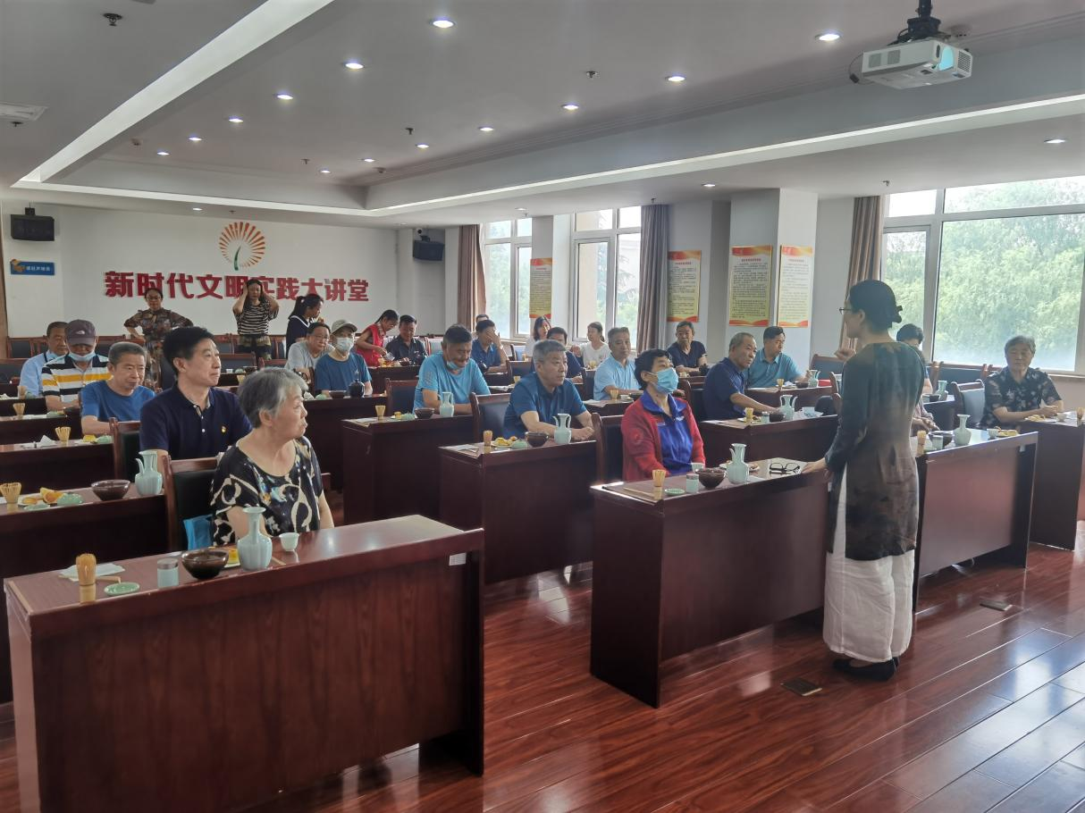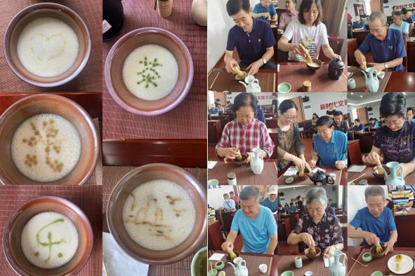 最后开展了茶道文化传承活动。中国是茶的故乡,饮茶历史悠久,茶兴于唐而盛于宋,宋代饮茶之风盛行,“点茶”是宋代的主要饮茶方式,是中国茶文化的重要组成部分,是文人雅士和普通百姓,休闲娱乐的重要方式,斗茶是宋人比试技艺,品鉴茶汤的重要活动,斗茶的内容主要有“点茶”和“茶百戏”。点茶将茶饼碾碎成末,沸水冲调,以“茶筅xiǎn”击拂,调出白色泡沫经久不散称为“沫饽bō”;文人常用清水或茶膏在汤面上题字作画称为“分茶”,也叫“茶百戏”。茶百戏是点茶的突出代表,将茶有品饮上升为艺术。我们邀请了青岛循宋国学文化传播有限公司李雨桐老师,带领老领导们学习体验趣味感与文化性兼具的点茶,了解中国历史和传统茶文化,老领导们积极参与,学习了知识也放松了身心。