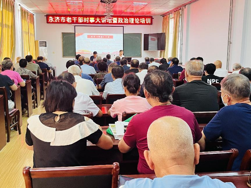 为深入学习贯彻中办《关于加强新时代离退休干部党的建设工作的意见》,持续加强离退休干部思想政治建设,7月20日,山西永济市委老干部局举办老干部时事大讲坛,特邀市委党校常务副校长卫青同志做题为《坚持和发展中国特色社会主义》辅导讲座,市委组织部副部长、老干部局长钟士慷主持,党委所属50个离退休干部党支部支委班子全体和部分理论学习骨干,局机关党员干部共计110人参加。