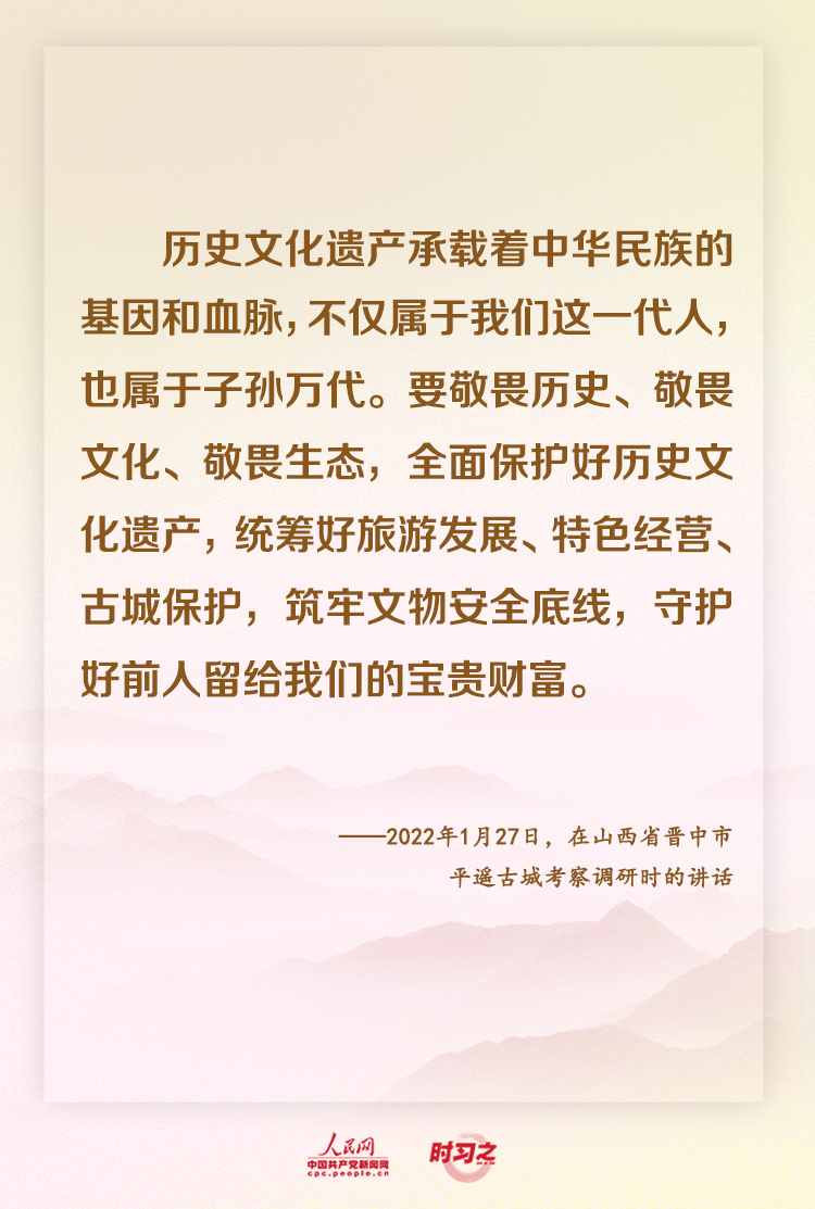 “做优秀传统文化传承者”——留住历史根脉、传承中华文明,一直是习近平总书记的所思所行。登古城、寻文脉、看非遗……2022年以来,他频频深入地方考察调研,对于守护中华文化,他始终饱含深情、念念不忘。