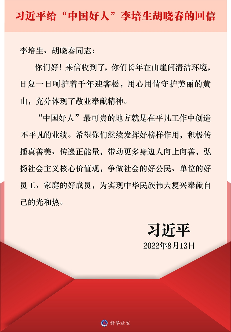 新华社北京8月14日电 中共中央总书记、国家主席、中央军委主席习近平8月13日给安徽黄山风景区工作人员李培生、胡晓春回信,对他们继续发挥“中国好人”榜样作用提出殷切期望。
