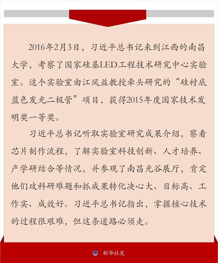2016年2月3日,习近平总书记来到江西的南昌大学,考察了国家硅基LED工程技术研究中心实验室。这个实验室由江风益教授牵头研究的“硅衬底蓝色发光二极管”项目,获得2015年度国家技术发明奖一等奖。