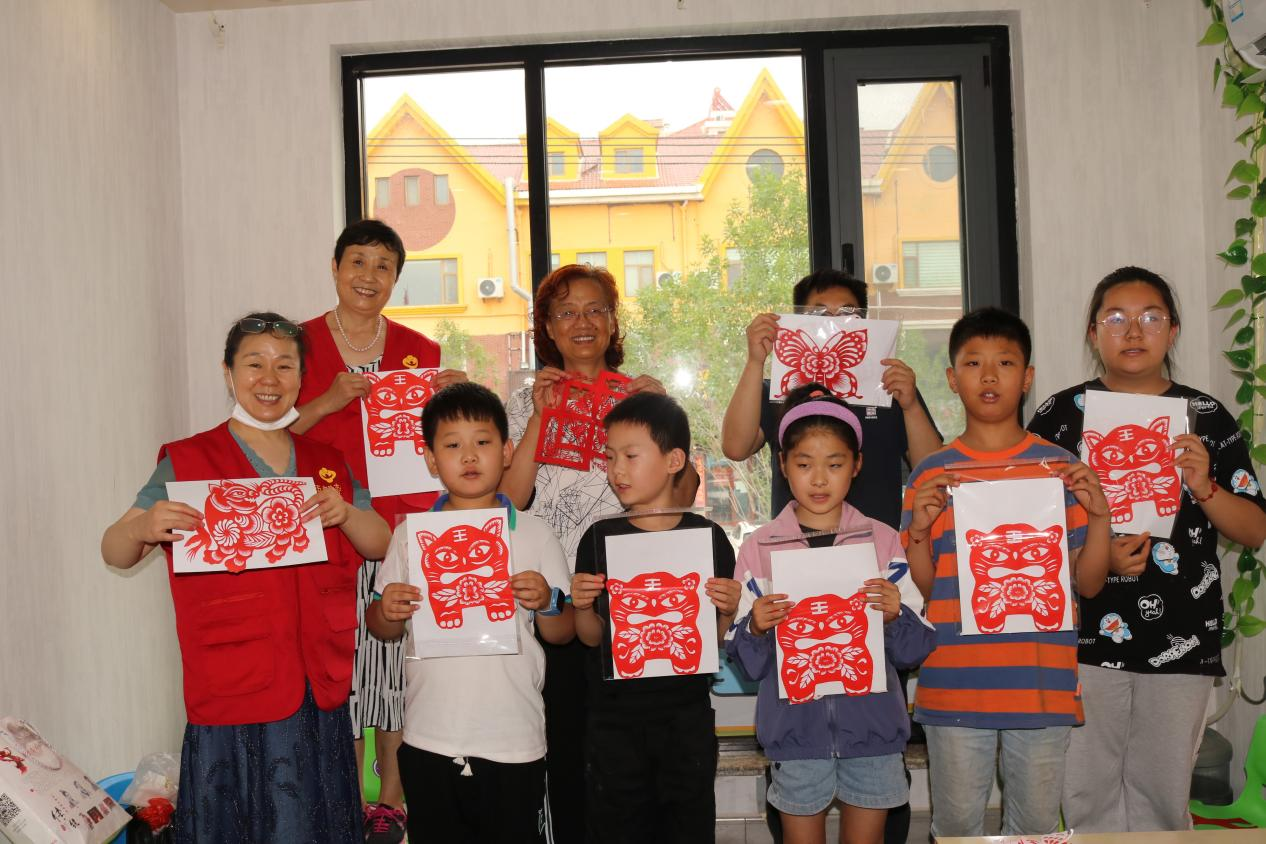 潍坊高密市老姊妹剪纸艺社的老干部们来到社区“四就近”服务综合体,教授孩子们剪纸技艺,和孩子们过快乐暑假。