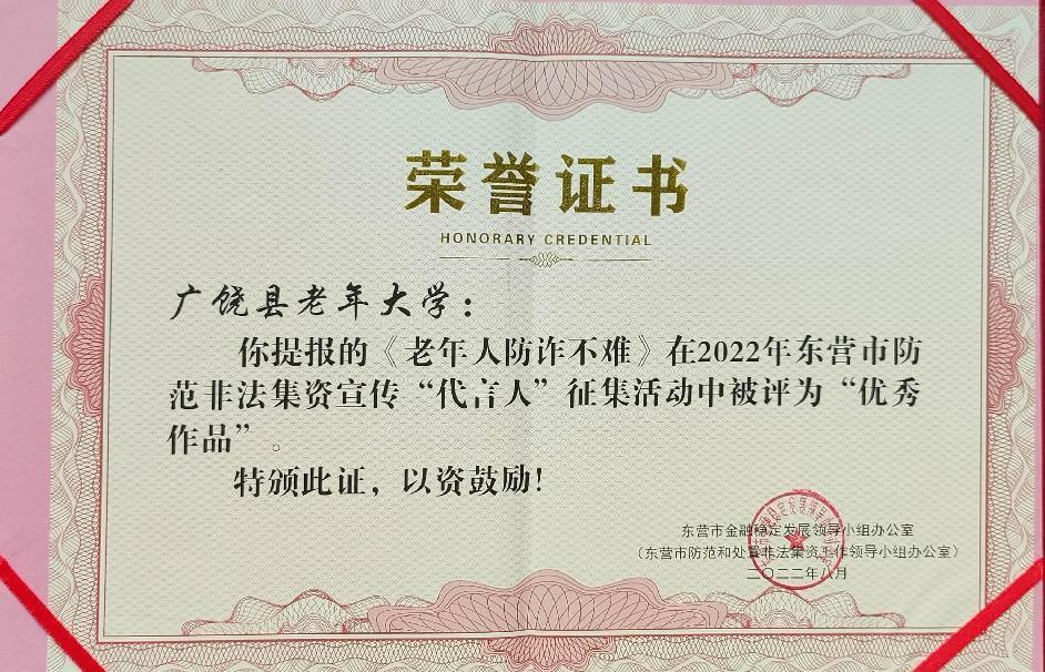 东营广饶县老年大学喜获两个奖项 2022-08-16 17:56 编辑:老干部之家 近日,在东营市防范和处置非法集资工作领导小组办公室、东营银行、大众网东营站联合举办的防范非法集资宣传“代言人”征集活动中,广饶县老年大学吕剧班学员刘好兰被评为“优秀代言人”,广饶县老年大学报送的作品《老年人防诈不难》荣获“优秀作品”。 查看所有评论