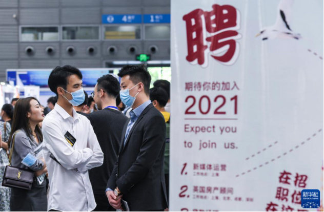 在广东深圳举行的第十九届中国国际人才交流大会设立的海归人才招聘会上,求职人员与企业招聘人员交流(2021年4月24日摄)。新华社记者 毛思倩 摄