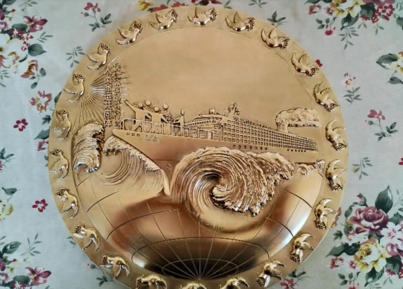 巨轮雄伟大气,浪花生动逼真,和平鸽活灵活现,这块精美的直径不到34厘米厚重的铜板浮雕作品《人类命运共同体》,从起稿创作到雕刻完成,凝聚了付连仁5年的心血。十九大以来,付连任认真学习,对人类命运共同体理念有了更加深刻的理解,萌生了创作《人类命运共同体》铜板刻雕的想法,他反复推敲修改一百多次,最终于2021年5月敲定了作品底稿,开始着手进行创作。一年来,他的制作室里几乎每天都会响起“叮叮当当”的锤锻声。他照着设计图,粗糙的双手在铜板上一点点凿刻、打磨,完善着每一个细节。仅仅“人类命运共同体”七个字,就耗费了他两个月的时间。一直到今年5月份,这幅作品才最终完成。