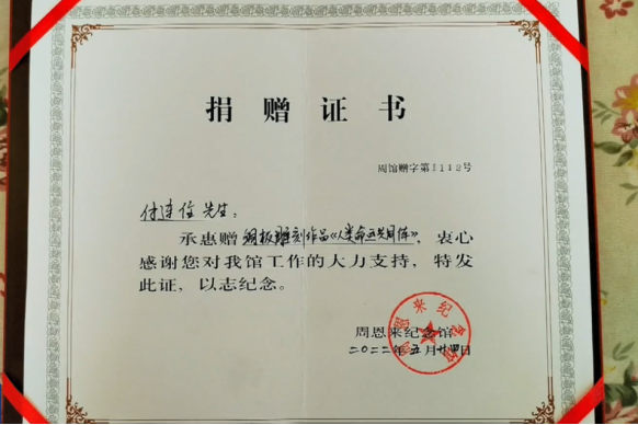 日前,潍坊高密市醴泉街道退休干部党员付连任将铜板浮雕新作《人类命运共同体》捐赠给周恩来纪念馆,用这种方式献礼党的二十大。