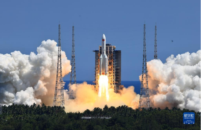 搭载问天实验舱的长征五号B遥三运载火箭,在我国文昌航天发射场点火发射(2022年7月24日摄)。新华社记者 李刚 摄