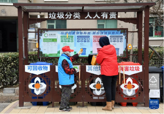 在北京市海淀区北太平庄街道金晖远洋社区,志愿者(左)指导社区居民垃圾分类(2021年3月5日摄)。新华社记者 任超 摄