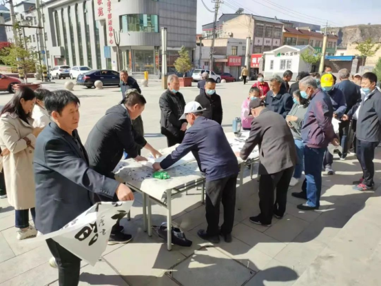 支部每次展出总有内容紧扣主题、笔力苍劲的上乘之作面世,览者总可一饱眼福。在建党一百周年和建国七十周年的展出中,王治忠同志刚劲秀拙的蝇头小楷《中国共产党章程》《中国共产党第十九次全国代表大会报告》等长卷,其中《中华人民共和国宪法》九十八米长卷更是夺人眼球,震撼人心。历年来,支部的工作风生水起,蒸蒸日上,诚然是活跃在神木这块沃土上的文艺轻骑兵。支部全体人员以民为本,服务大局,一如既往,而且年年有新招。今年元月份,分组到兴神路社区,陕煤凉水井矿区,退役军人事务局义写春联。五月份与老年大学合办“庆五一”书画笔会,为群众义赠书画作品逾百幅,后又为颐福阁敬老院创作书画精品百余幅。六月份,参加大保当永安村幸福院启动仪式,现场丹书作品60多幅。七月份,在市委组织部主办的“喜迎二十大 翰墨夕阳红”大型书画展出中40多幅作品入选。