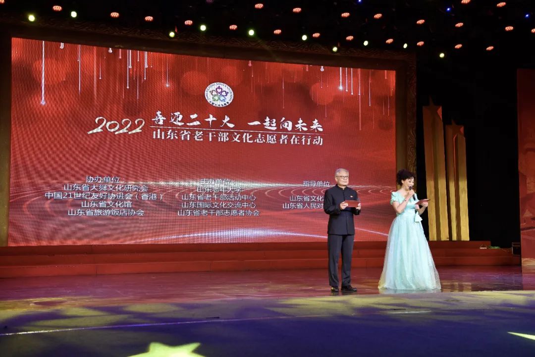 用艺术点亮幸福生活,以文化激发奋进力量。为喜迎党的二十大胜利召开,8月22日下午,由山东省文化和旅游厅、山东省人民对外友好协会指导,山东老年大学、山东省老干部活动中心、山东国际文化交流中心、山东省老干部志愿者协会联合主办,山东省大舜文化研究会、中国21世纪友好协进会(香港)、山东省文化馆、山东省旅游饭店协会协办的“喜迎二十大,一起向未来”专场文艺演出在山东省老干部活动中心报告厅成功举办。