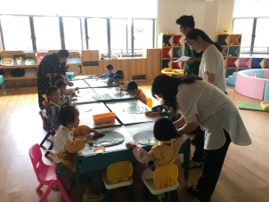 课上,李凌君老师工作团队们为“小画家们”准备了画布、染料等用具,并对基础绘画进行讲解。在老师的指导下,“小画家们”纷纷穿上围裙,认真动起手来,画出了一幅幅与众不同的创意画。看着自己的创意成果,孩子们很有成就感,愉悦地给其他小朋友介绍自己的作品。