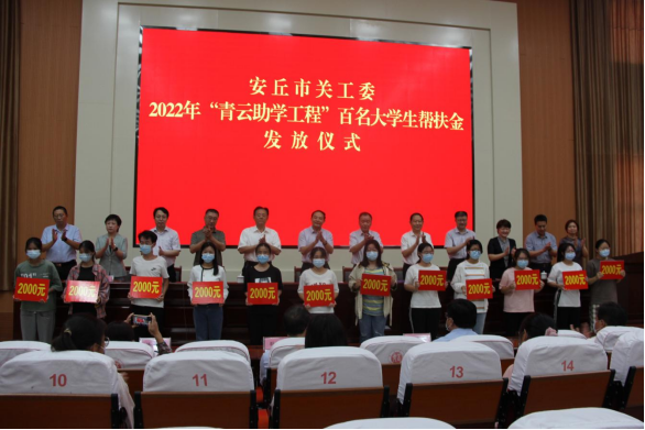 8月27日,安丘市关工委举行2022年“青云助学工程”百名大学生帮扶金发放仪式,市关工委主任李广庆同志主持会议并讲话,各副主任、秘书长等关工委领导同志参加会议,现场为安丘市95名新入学大学生,发放助学金21.4万元。