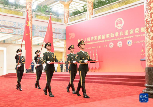 2019年9月29日,礼兵护送“共和国勋章”“友谊勋章”和国家荣誉称号奖章入场。当日上午10时,中华人民共和国国家勋章和国家荣誉称号颁授仪式在北京人民大会堂隆重举行。新华社记者 丁海涛 摄