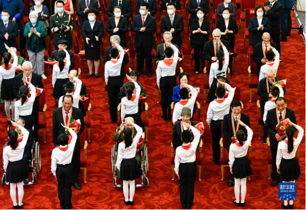 2021年6月29日,庆祝中国共产党成立100周年“七一勋章”颁授仪式在北京人民大会堂金色大厅隆重举行。这是少先队员向勋章获得者献花,敬礼致意。新华社记者 高洁 摄