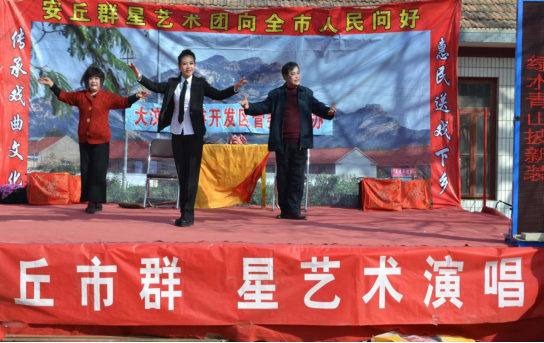 瞄准农村群众日益增长的精神文化需求,组建老年大学“岁月如歌”艺术团和“老干部群星艺术团”,编演《谁养妈》《夺碗》《老俩口赞新风尚》《全民总动员 扫黑除恶齐参战》《爱心扶贫》等文艺节目25个,以群众喜闻乐见的茂腔、歌舞、快板剧、表演唱等形式,在潜移默化中进行乡村振兴、孝亲敬老、乡风文明、扫黑除恶等方面宣传教育。目前,共巡回演出23场,观众达5000余人次。