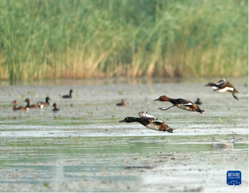 夏日的白洋淀,碧波荡漾,荷红苇绿。辽阔的水面上,一群活泼可爱的青头潜鸭幼鸟跟随“父母”在芦苇丛中穿梭。这意味着,世界极度濒危物种青头潜鸭将白洋淀作为了繁殖地。