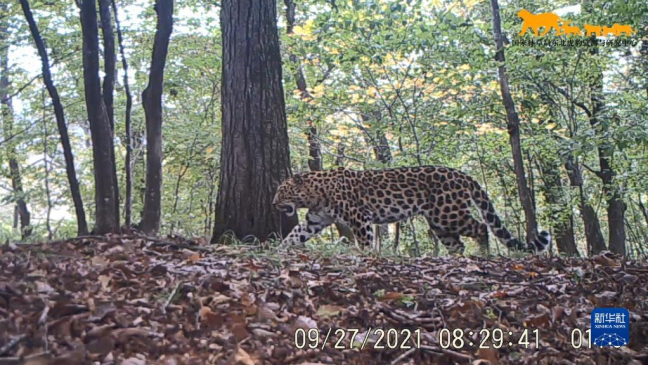 这是2021年9月27日利用“天地空一体化监测系统”在东北虎豹国家公园内监测到的野生东北豹影像(视频截图)。 新华社发