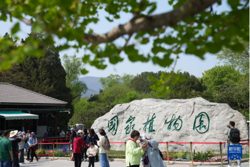 游客在位于北京的国家植物园入口处参观(2022年4月18日摄)。 新华社记者 鞠焕宗 摄